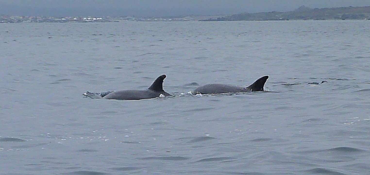 Unser Glück hält an, denn kaum sind die Finnwale abgetaucht wird unser Boot von einer Gruppe großer Tümmler begleitet. Wir erfahren, daß sie im El-Nino-Jahr 1978 mit einer warmen Meeresströmung gekommen und seitdem geblieben sind.