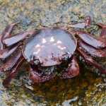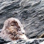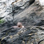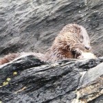 Wir können die Kobolde des Meeres, die flinken Seeotter, auf einem Felsen im Meer beim genüsslichen Verspeisen eines Krebses beobachten.