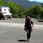 Wir sind von der kurzen Nacht auf der Fähre müde und schlafen erst einmal eine Runde, bevor wir in den Parque Nacional Pumalin weiterfahren. In der zweiten Nacht, die wir dann in der Einsamkeit des Parks verbringen, bebt die Erde. Ein leichtes Zittern, das vier, fünf mal unter dem Wagen durch den Boden läuft, nicht stark, aber doch so daß man davon aufwacht. In Chile hatten wir dies schon öfter erlebt und uns langsam damit „angefreundet“, aber es ist etwas völlig anderes, wenn man in stockfinsterer Nacht direkt zu Füßen eines sichtlich nervösen Vulkans nur sechshundert Meter über dem Kopf steht, auf vielen Kilometern keine Menschenseele weit und breit, keine Möglichkeit sich zu informieren. Für einen Moment überkommt einen ein beklemmendes Gefühl des Ausgeliefertseins. Jetzt am besten noch einen Krimi lesen, in dem ein blutrünstiger Axtmörder in Patagonien sein Unwesen treibt, und … gute Nacht.