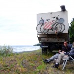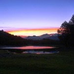 Wir finden einen abgeschiedenen Nachtplatz ein einem kleinen See mitten im Wald und genießen die wunderbare Abendstimmung und das Spiegelbild der Berge auf dem Wasser, als die Sonne untergeht.