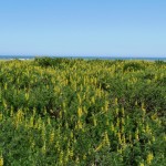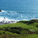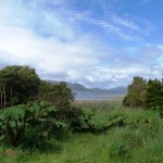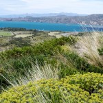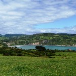Ohne konkretes Ziel fahren wir die Piste weiter und gelangen zu einem Platz hoch über einer wunderschönen Bucht. Die sanfte Hügellandschaft mit ihren sattgrünen, mit bunten Frühlingsblumen übersäten Wiesen erinnert ein bisschen an Irland, die Kühe und Schafe grasen auf Weiden, die bis zu den Stränden hinunter reichen, bizarr geformte Bäume signalisieren eindeutig die vorherrschende Windrichtung und das Meer glitzert in einem karibischen Türkisblau. Bei Sonne scheint die Insel geradezu zu leuchten. Spontan beschließen wir, hier ein bisschen zu bleiben.
