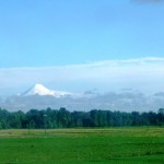 Je weiter nach Süden wir kommen desto grüner wird die Landschaft. Neben Weizenfeldern und Obstplantagen fahren wir auch entlang großer bewässerter Reisfelder. Wenn wir links aus dem Fenster blicken reiht sich wie auf einer Perlenkette ein schneebedeckter Vulkangipfel an den anderen, das Panorama vor dem blauen Himmel ist wunderschön.