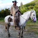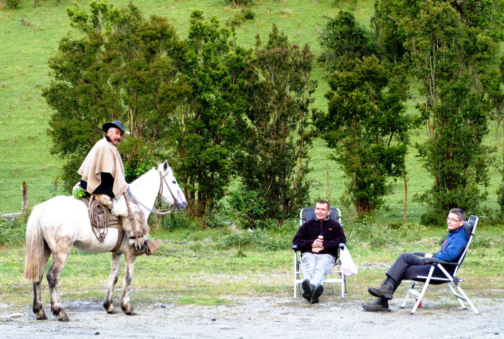 Der stolze Reiter mit den wunderbaren, den Chilenen ganz eigenen höflichen Umgangsformen, hält ein freundliches Schwätzchen mit uns, erklärt, daß die Ziegenfall-Leggins die Feuchtigkeit abhalten, die Steigbügel alt und aus Holz handgeschnitzt sind und daß er eine kleine Website betreibt. Ich bin mir nicht sicher, ob ich ihn richtig verstanden habe, aber ja, es stimmt: Er bewirbt sein Ein-Mann-Unternehmen ganz professionell über das Internet. Er besitzt zehn Pferde und wer möchte, kann mit ihm mehrtägige Ausritte ins Valle Cochamo machen. Das tiefe, unzugängliche Tal mit uralten Wäldern ist unter Freeclimbern als spektakuläres Klettergebiet bekannt. Hier gibt es bis zu 1000 Meter hohe vertikale Granitwände, ähnlich denen im Yosemite-Park in den USA, aber im Gegensatz dazu ist diese Region nicht mit Freeclimbern überlaufen.
