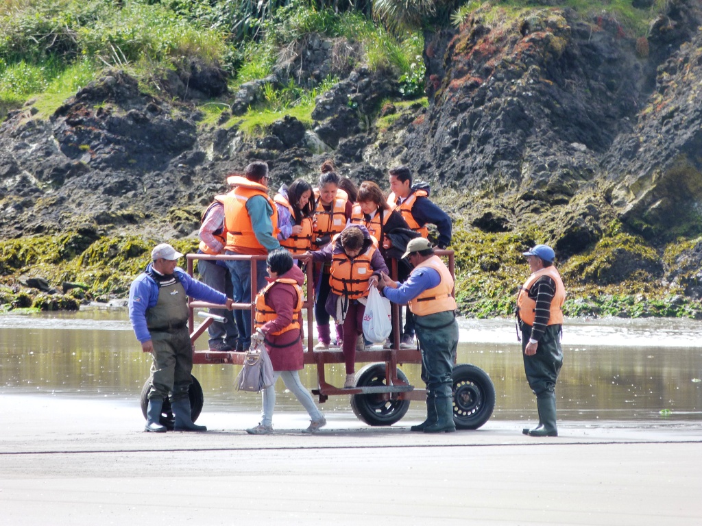 Wir fahren nach Ancud ganz im Norden der Insel, mit knapp 40.000 Einwohnern die zweitgrößte Stadt auf der Hauptinsel und von den Spaniern 1767 als Verteidigungs- und Versorgungsposten für die Kap-Hoorn-Segler angelegt. Die Bebauung aus Holzhäuschen rund um die zentrale Plaza und den Hafen ist eng und verwinkelt, so daß wir mit dem Unimog ziemlich rangieren müssen. Wir fahren weiter zur Halbinsel Lacuy, wo man frische Austern essen kann, und schon bald geht die bisher geteerte Straße in eine Schotterpiste über. Auf kleinen Inseln vor der Küste von Punihuil nisten während der Sommermonate mehrere Kolonien von Magellan– und Humboldt-Pinguinen und wir beobachten vom flachen Sandstrand aus, wie einige Touristen aus einem kleinen Fischerboot ausgebootet und mit einem großrädrigen Karren mit dicker Gummibereifung trockenen Fußes durch das seichte Wasser zurück ans Land gebracht werden.