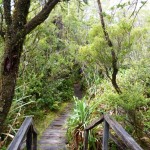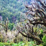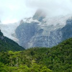 Südlich von Puyuhuapi führt die Carretera Austral durch den Parque Nacional Queulat, einen Urwald mit hohen Bäumen, Bambus, Scheinbuchen, rotblühenden Fuchsiengewächsen, Lianen, Farnen und Nalca-Pflanzen, dem wilden Rhabarber Patagoniens. Vom Parkeingang aus führt eine 3,5 Kilometer lange Wanderung bis zu einem Aussichtspunkt, der den Blick auf den Ventisquero Colgante, den hängenden Gletscher freigibt. Der Himmel ist mit dicken grauen Wolken verhangen, aber wir beschließen, trotzdem loszumarschieren. Es geht durch einen Zauberwald mit von dichten Moosen und Flechten besetzten Bäumen, über gewaltige Felsbrocken, vorbei an Riesenfarnen und jungen Trieben, die sich im Schatten der Urwaldriesen gerade erst ausrollen.