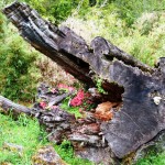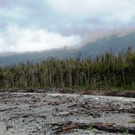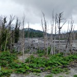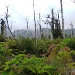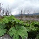 Die Spuren der Verwüstung sieht man heute noch deutlich, aber man sieht auch, wie sich die Natur langsam erholt. Großblättrige Nalca-Pflanzen und Farne bedecken schon die dicke Ascheschicht auf dem Boden rund um die abgestorbenen, gespenstisch wirkenden Stämme der einstigen Urwaldbäume und bringen Grün in die graue Ödnis.