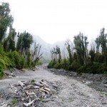 Niemand begegnet uns, niemand folgt uns, bis wir Stunden später wieder die Carretera erreichen, die kurz darauf von Asphalt zu Schotter wechselt. Die Landschaft ändert sich augenfällig. 1991 brach der nordwestlich gelegene Vulkan Hudson aus und ließ auf weite Teile der Region tagelang Asche regnen. Infolgedessen starben viele Wälder ab und bis heute ragen die toten Stämme aus grauen Hängen gespenstisch in den Himmel.