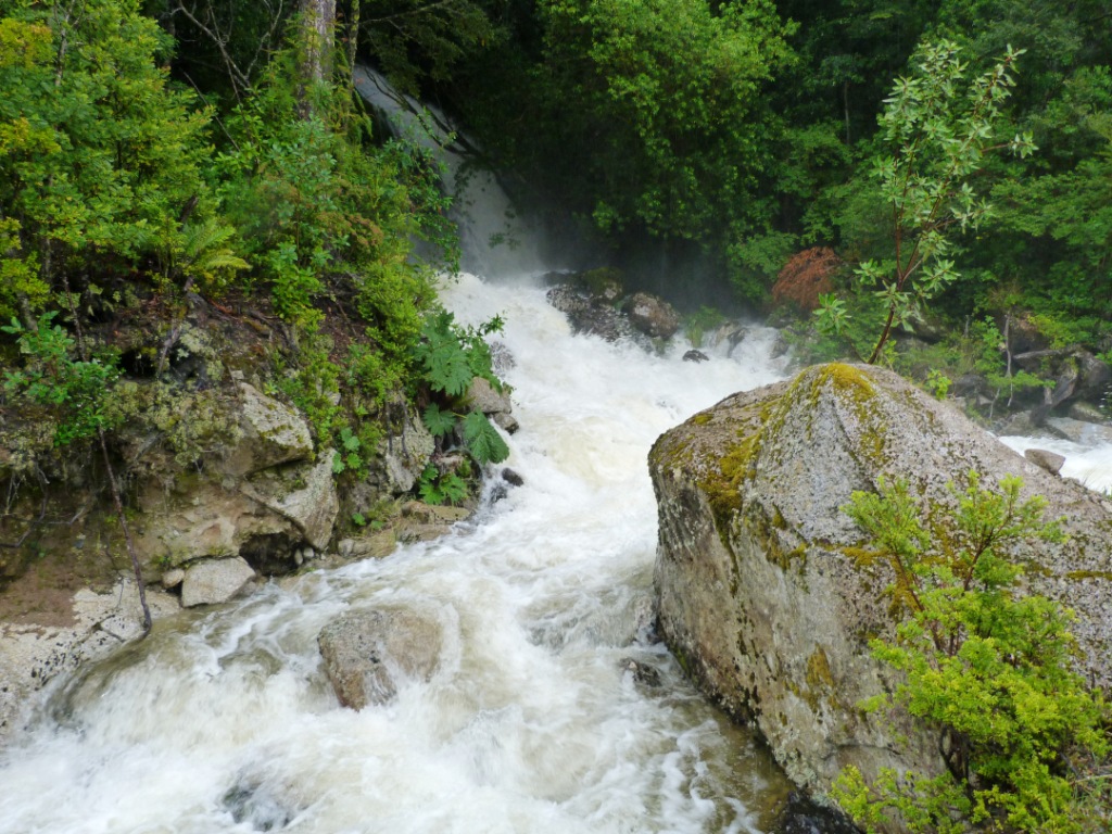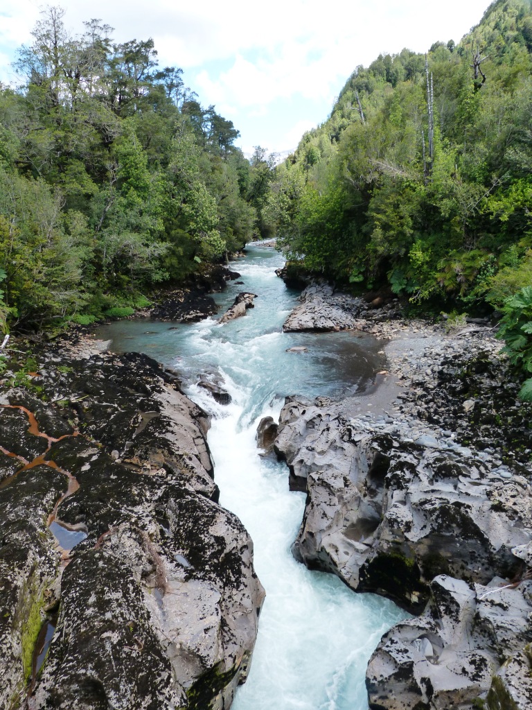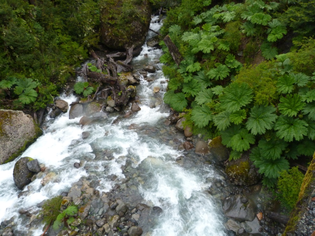 Das pazifisch-feuchte Klima lässt den Wald hier wuchern, das Dickicht aus Farnen, Nalca und Schlingpflanzen ist undurchdringlich, an den Steilhängen stürzen Wasserfälle Hunderte Meter hinab und der grün schimmernde Rio Bayo windet sich dicht entlang der Straße.
