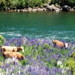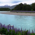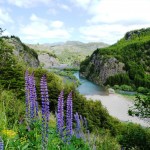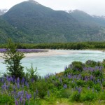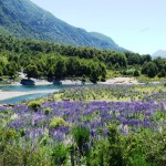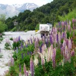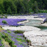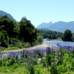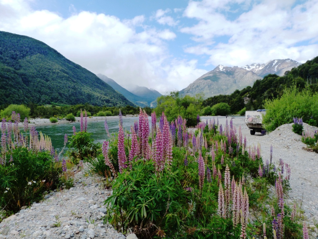 Unseren Stellplatz für die Nacht finden wir im Kiesbett am Rio Futaleufú, umgeben von Lupinen.