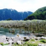 Viele der Flüsse werden von Gletschern gespeist und ihr Wasser schimmert in einem milchig-grünen Weiß. Wir drehen eine kleine Runde in dem idyllischen 2000-Seelen-Dorf Futaleufú und fahren dann in eine weiteres Tal, das Valle California ein gutes Stück hinter Palena. Hier erinnert die Landschaft mit etwas Phantasie an Südtirol und durch ein besonders mildes Mikroklima gedeihen hier sogar Zitrusfrüchte.