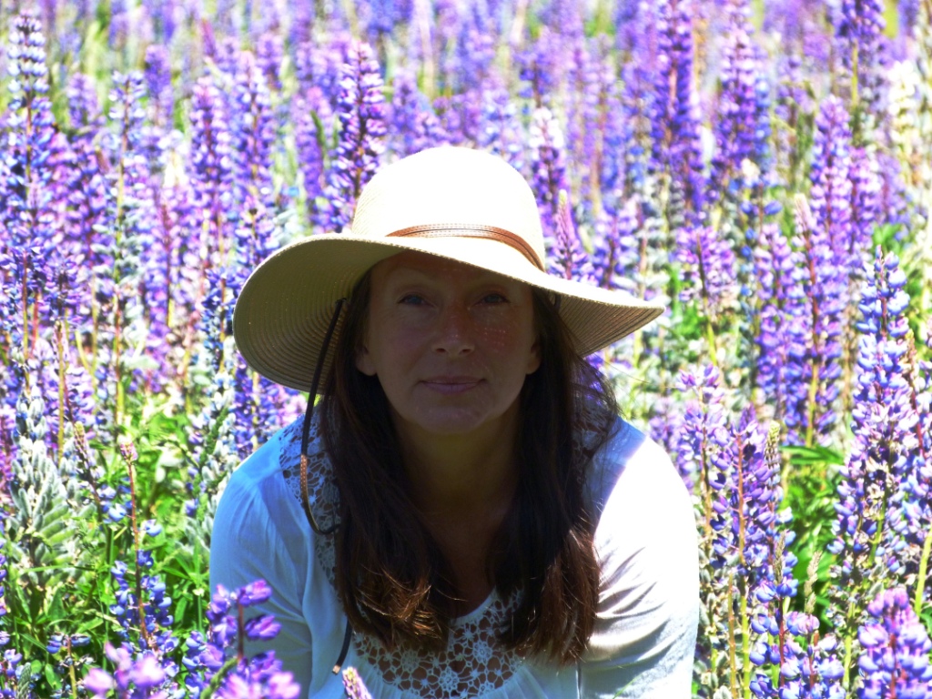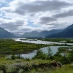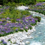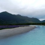 Entlang der Straße und in den Kiesbetten der türkis-blauen Flüsse blühen dicht an dicht Abertausende lila Lupinen, die noch dazu einen intensiven Duft verströmen. Die leuchtende Farbe ist ein wunderbarer Kontrast zu den schneebedeckten Gipfeln der Berge im Hintergrund, dem Grün der Wiesen, dem Türkis der Flüsse und dem Blau des Himmels. Wir können uns gar nicht satt sehen an dieser Blütenpracht.