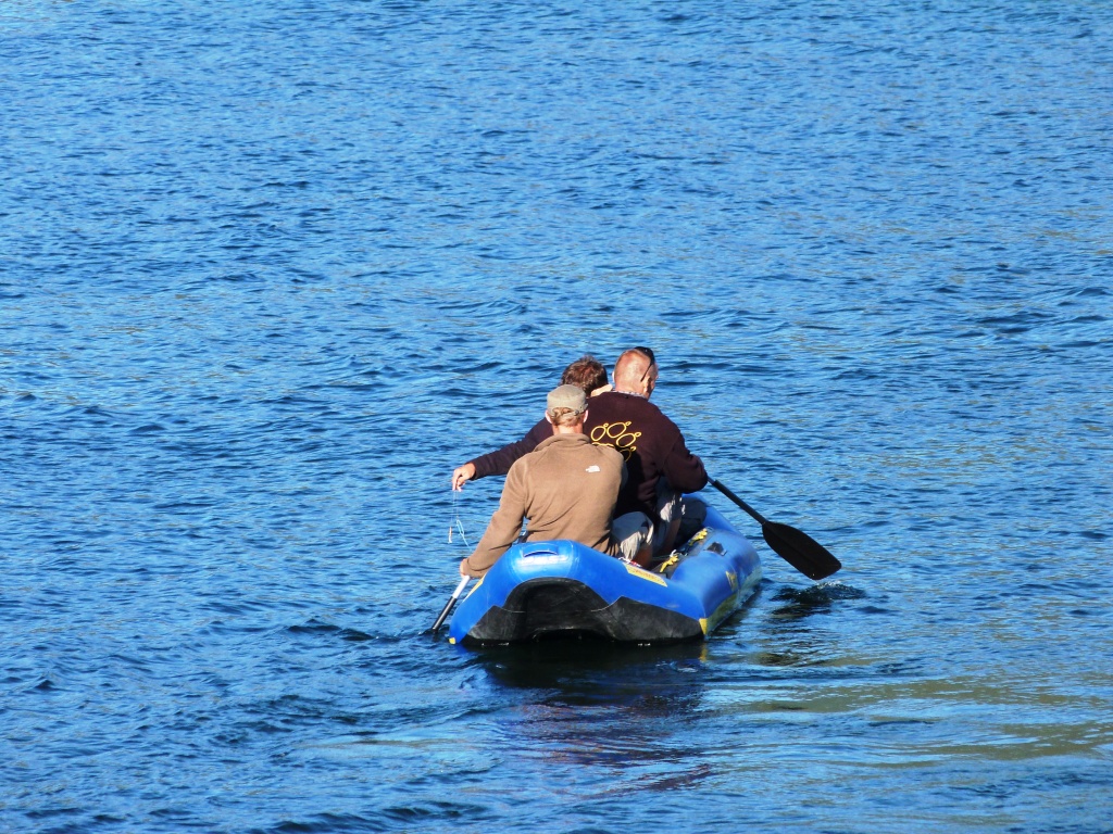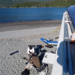 Die beiden Jungs gestehen, daß sie hungrig wie Wölfe sind, denn an Bord sind zu allem Unglück auch noch die Nahrungsmittel ausgegangen. Nachdem wir die beiden mit Brot und Salami abgefüttert haben erfahren wir mehr. Beide sind Mitte zwanzig, kommen aus dem Schwabenländle, haben gerade ihr Studium beendet und bereisen jetzt mit ihrem kleinen Boot, zwei Paddeln, Neoprenanzug, Zelt, Minimalgepäck und Satellitentelefon für einige Monate die Flüsse Chiles, Ecuadors und Brasiliens, bevor es zum Abschluß zum „Chillen“ nach Panama geht. Wir finden, daß das eine ganz tolle Art zu reisen und eine außergewöhnliche Perspektive ist, sich ein Land anzuschauen. Es muß sehr schön sein, über die türkisfarbenen Flüsse zu paddeln, über schäumende Stromschnellen durch den Urwald zu jagen, vorbei an blühenden Wiesen, durch enge Schluchten mit großen Granitblöcken, vom Boot aus Lachse oder Forellen zu angeln und abends bei einem Lagerfeuer auf einer Kiesbank mitten im Fluß zu campieren. Mit der Romantik ist es allerdings vorbei, wenn eine typisch patagonische Schlechtwetterfront mit Regen und horizonal stürmendem Wind hereinzieht. Dann kann es sein, daß man Tage im Zelt verbringen muß, die Klamotten und der Schlafsack sind irgendwann klamm und die Moral am Boden.