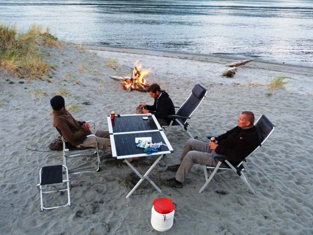 Dort, wo der Rio Palena ins Meer mündet, schlagen wir unser Camp auf. Hugo lässt sich von den Jungs noch eine Runde wie Graf Koks über den Fluß paddeln, dann wird sich der genetisch zutiefst verankerten männlichen Aufgabe des Feuermachens gewidmet.