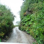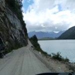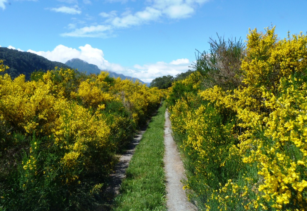 Wo das Tal offener wird ist die Piste von dicken Büschen gelb blühender Lupinen gesäumt. Die Piste ist zum überwiegenden Teil aus Kies aufgeschoben, teilweise bis weit über einen Meter hoch, und ihre Seiten sind unbefestigt. Hier abzurutschen hätte üble Folgen.