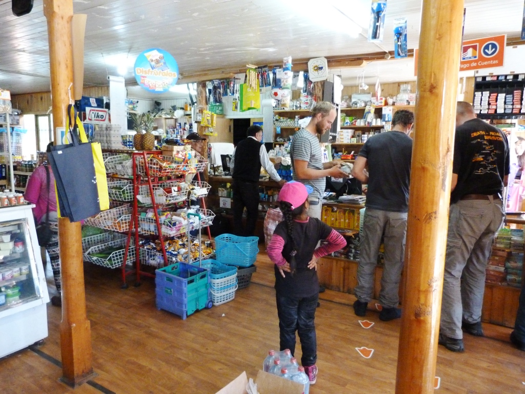 Von der Küste geht es die gleiche Strecke – es gibt nur diese eine Schotterpiste durch den Urwald – vorbei an den kleinen Schaf- und Rinderfarmen zurück nach La Junta, wo wir im Dorfladen unseren Proviant aufstocken. Gemüse und frisches Obst sind Mangelware; wenn nicht gerade der wöchentliche oder monatliche LKW aus Puerto Montt eine frische Ladung gebracht hat, ist außer Zwiebeln nicht viel zu bekommen. Stattdessen führt der kleine Laden mindestens dreißig verschiedene Putzmittel für den Haushalt.