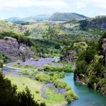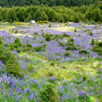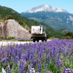 Der Himmel ist über Nacht vollständig aufgeklart und Patagonien zeigt sich von seiner schönsten Seite. Die Sonne strahlt heiß von einem wolkenlosen Himmel. Die auch so schon herrliche grüne Landschaft schaut aus, als hätten die Götter im Rausch der Farben hemmungslos lila Granaten auf die Erde geworfen und explodieren lassen.