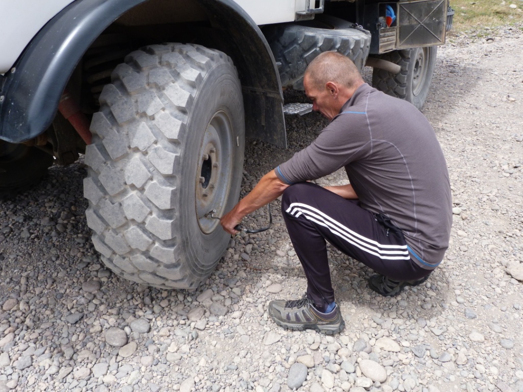 Da die Piste ist in schlechtem Zustand ist läßt Hugo Luft aus den Reifen, um das stundenlange Fahren etwas komfortabler zu machen..