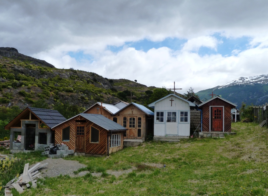 Kurz bevor wir wieder Puerto Tranquilo am Westufer des Lago General Carrera erreichen sehen wir einen typischen patagonischen Friedhof. Hier baut man den Verabschiedeten kleine Häuser mit Haustür und Fenstern aus Glas, die häufig sogar mit Gardinen ausgestattet werden.
