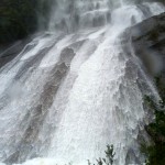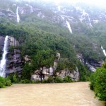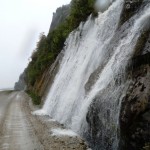 Über Nacht sind Hunderte neuer Kaskaden hinzugekommen, die ihre rauschenden Wassermassen die Felsen hinab jetzt bis auf die Piste ergiessen, so daß unser Wagen ab und an unfreiwillig eine eiskalte Dusche erhält.