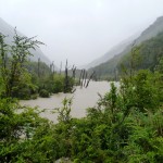 Wir finden einen einsamen Nachtplatz auf einem Kiesbett des Rio Bayo. Über Nacht werden die Wolken zu schwer und laden ihre nasse Last ab; Regentropfen trommeln ihr Stakkato ohne Unterlaß laut auf unser Dach. Es kommt wie es kommen muß. Als wir am nächsten Morgen aus dem Fenster schauen staunen wir nicht schlecht: Wir stehen auf einer Insel und der Unimog mit den Füßen bereits im Wasser. Da es noch immer wie aus Kübeln gießt parken wir schleunigst den Wagen auf höheres Gelände am Ufer und widmen uns erst dann dem Frühstück. Zwei Stunden später ist die Kiesbank ganz verschwunden. Der Rio Bayo hat seine Größe mehr als verdoppelt und auch seine Fließgeschwindigkeit hat deutlich zugenommen. Der oft schon gelesene Satz „Der Fluß hatte sich über Nacht in einen reißenden Strom verwandelt“, hat hier für uns eine sehr konkrete Bedeutung erhalten.
