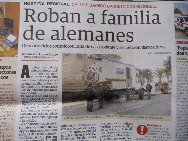 Unterwegs sehen wir viele Streckenposten der Polizei, die uns aber immer freundlich durchwinken. Trotz der vielen Kontrollen trägt die PanAm in Südamerika den Namen „Carretera Criminal“, da es immer wieder zu brutalen Raubüberfällen kommt. Die Täter provozieren Unfälle und rauben dann die Opfer aus oder tarnen sich als falsche Polizisten. Nachtbusse auf der Strecke fahren inzwischen in Konvois von neun oder zehn Fahrzeugen, da die Täter selbst vor den Reisebussen nicht halt machen. Wir versuchen, Nachtfahrten soweit wie möglich zu vermeiden, zumal wir mit dem Mog nicht die Schnellsten sind.
