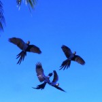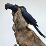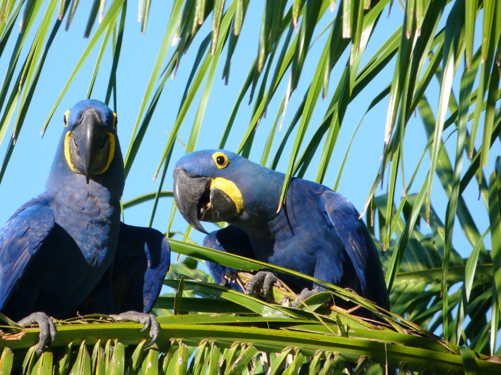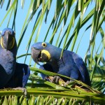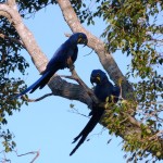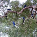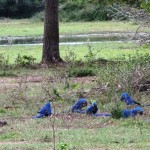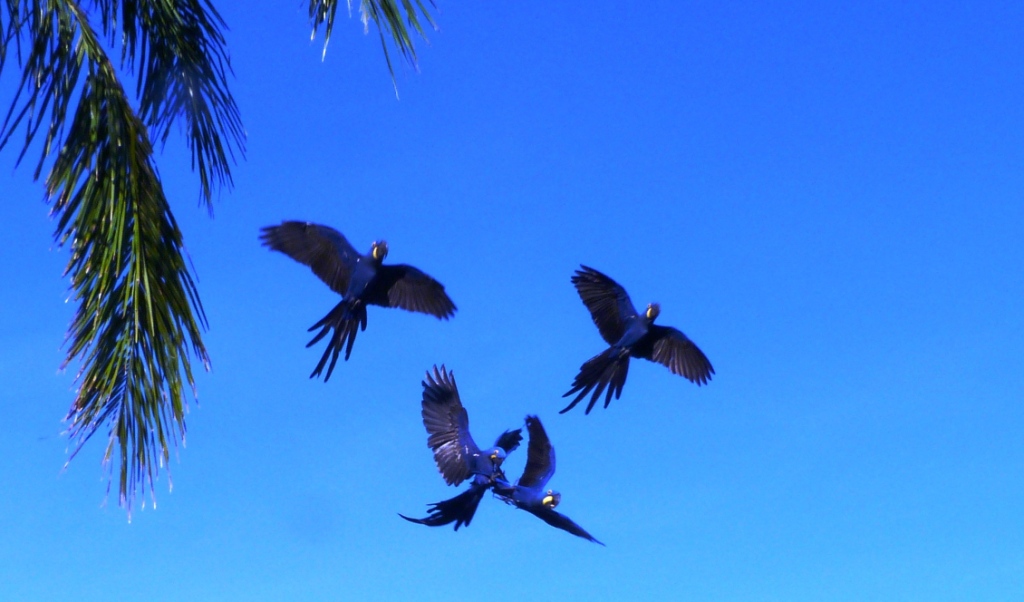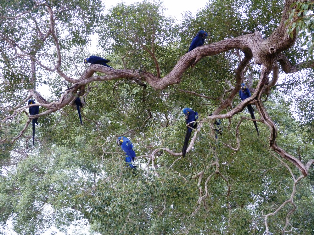 Dann kneife ich die Augen zusammen, da ich nicht glauben kann was ich sehe: In einem fast gänzlich entlaubten Baum entdecke ich Hyazinth-Aras mit ihrem blauen, leicht ins Violette schimmernden Gefieder und dem markanten gelben Pinselstrich um die Augen! Ich hätte nie gedacht, jemals einen Ara Azul in seiner natürlichen Umgebung erleben zu können, und hier zähle ich gleich zwölf Tiere, die entspannt Früchte knabbern und dabei genüsslich vor sich hin krakelen. Sie beobachten mich genauso aufmerksam wie ich sie. Dann startet eine Gruppe von ihnen in vollendeter Formation zu einem Tiefflug über die Farm; ihre Größe und ihre langen Schwanzfedern sind beeindruckend. Nach einiger Zeit kommen sie zurück und kündigen ihre Landung schon von weitem lautstark an.