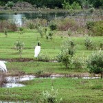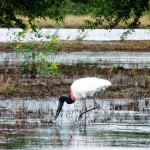 Egal, hier auf der Fazenda Sao Joao jedenfalls kann ich meiner animalischen Leidenschaft hemmungslos und ohne schlechtes Gewissen frönen und so gehe ich auf Pirsch. Die Kaimane liegen reglos und mit halb geschlossenen Augen im seichten Wasser, zwei weiße Jabirus mit schwarzen Köpfen – die großen Störche und Wahrzeichen des Pantanal – stolzieren auf ihren langen Beinen erhaben durch das Gras, rund um unseren Stellplatz zetern lautstark die grünen Sittiche und kleinen Papageien. In den Baumkronen entdecke ich großen Gruppen von Gelbbrust-Aras mit ihren leuchtend-blauen Flügeln und einem roten Farbtupfer auf der gelben Brust, der aussieht wie ein kleines rotes Herz. Etwas entfernt davon sehe ich hellrote Aras Vermelhas im Tiefflug über die Landschaft jagen.