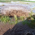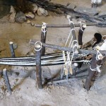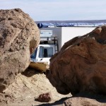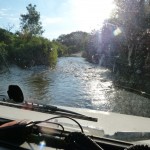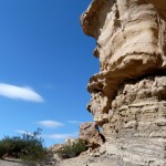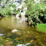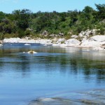 Wir finden einen schönen Stellplatz im Gebüsch am Ufer des Flusses. In den Bäumen rundum leben kleine grüne Papageien und andere Vögel, und vor unseren Füßen hüpfen Microfrösche von einem Zentimeter Größe durch den Sand. Am nächsten Morgen sitzen wir noch vor dem Frühstück gemütlich im glasklaren Wasser des Rio Pinto und genießen die Abgeschiedenheit in der Natur. Außer den lärmenden Papageien ist niemand da, der uns stören könnte. Dumm nur, daß meine Flipflops von einer Welle erwischt und davon gespült werden.